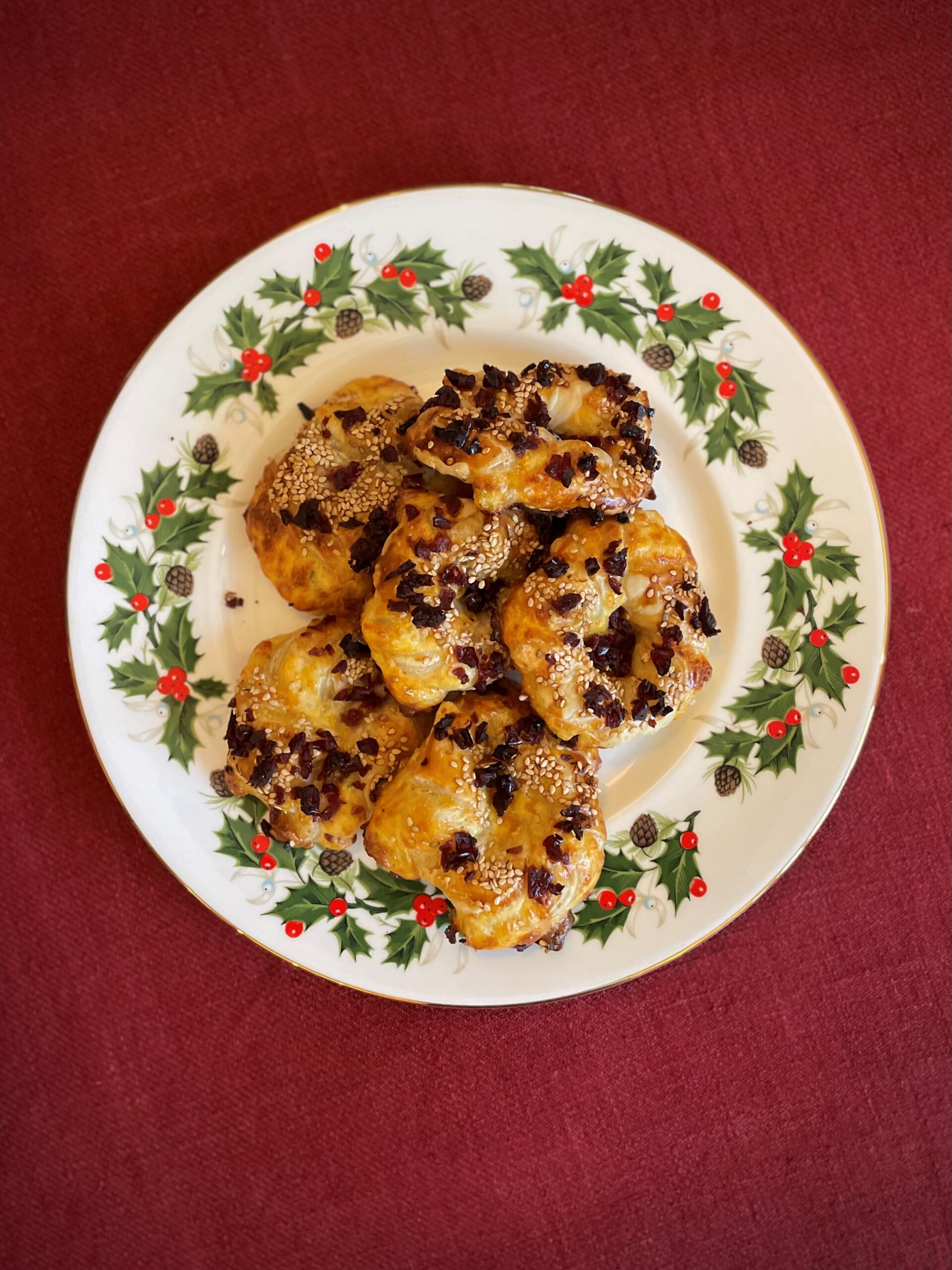 Bre ostenblandingen over halve butterdeigen og fold den andre delen over. Bruk en pizzakutter og skjær 6 lange strimler. Vri hver stimmel og rull sammen til en knute. Pensle med sammenvispet eggeplomme. Legg på litt syltetøy og strø over sesamfrø.