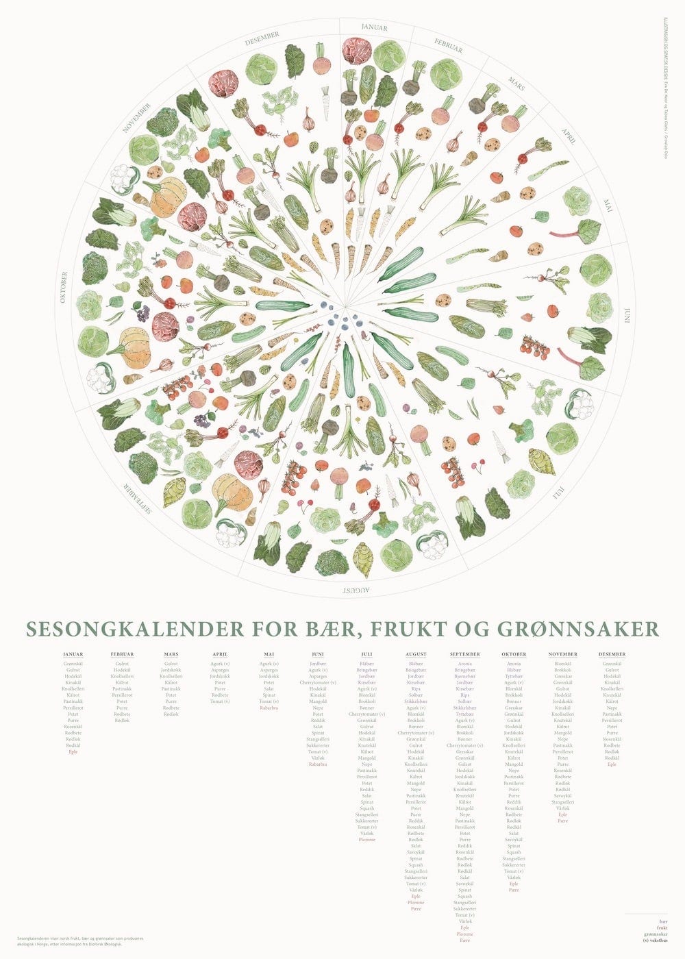 Sesongkalenderen er en infografisk plakat som viser hvilke økologiske grønnsaker, frukt og bær som er i sesong til enhver tid av året i Norge. Plakaten er basert på informasjon fra Bioforsk Økologisk.